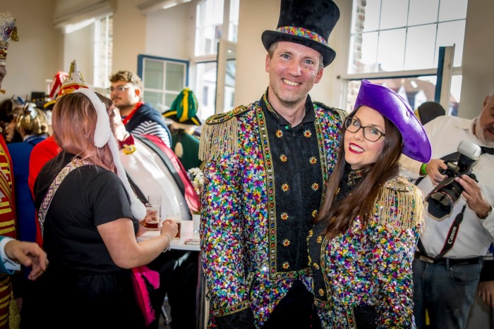 Sitzungspräsident Marcus empfängt auf unserer Prunksitzung das Dreigestirn der KG Närrische Schmetterlinge. Der Prinz des Dreigestirns ist unser 2. Vorsitzender Michel Caltagirone. Was an diesem Tag noch niemand wußte: In der kommenden Session gibt es einen "Rollentausch" und Vorstandsmitglied Michel wird Prinz Marcus auf unserer Sitzung empfangen